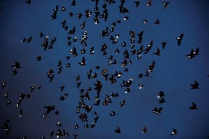 Pigeons with LED lights attached to them fly overhead as part of the “Fly By Night” art installation by artist Duke Riley above the Brooklyn borough of New York, U.S.,May 5, 2016. REUTERS/Lucas Jackson